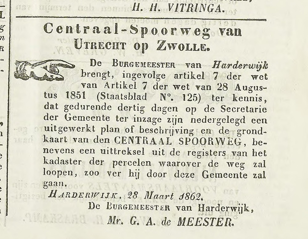 De burgemeester van Hardewrijk brengt, ingevolge artikel 7 der wet van artikel der wet van 28 augustus 1851 ( staatsblad no. 125) ter kennis, dat gedurede dertig dagen op de Secretarie der Gemeente ter inzage zijn nedergelegd een uitgewerkt plan of beschrijving en de grondkaart van den CENTRAAAL SPOORWEG, benevens een uitreksel uit de registers van het kadaster der percelen waarover de weg zal lopen, zo ver hij door deze Gemeente zal gaan.